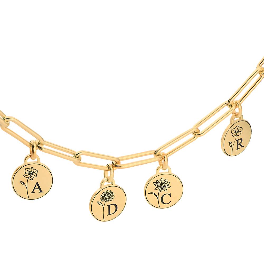 Saluda a nuestra pulsera con dije de inicial de flor de nacimiento de pradera en baño de oro de 18 quilates: un radiante jardín de recuerdos queridos. Cada uno de los 1-6 dijes está adornado con iniciales grabadas y flores de nacimiento elegidas, simbolizando la belleza de las conexiones personales. Ya sea adornando tu propia muñeca o la de un ser querido, esta pulsera es un tributo dorado al amor y legado, perfecta para capturar el calor del verano donde sea que la vida nos lleve.